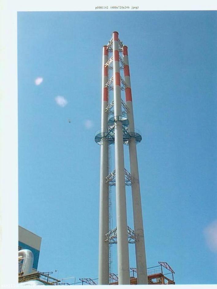 1)钢烟囱施工采用钢材:钢板厚度为16㎜、长度为20m、经卷板机加工制作成直径为1.4m的圆筒型、然后对所有缝口进行内外焊接、焊接时,应焊浆饱满、无孔洞、表面光滑平整。